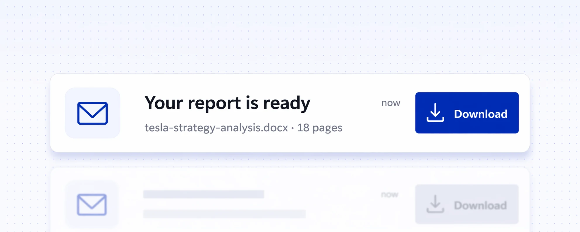 3 free credits. No card. Finished report, PDF, or deck lands in your inbox the moment it's ready.