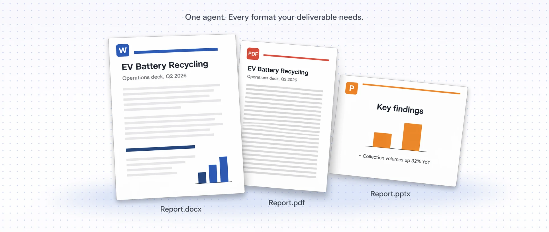 The agent runs live web research, reads the files you uploaded, and places logos, photos, and source material directly into the .docx, .pptx, or .pdf it builds. We'll email it to you.