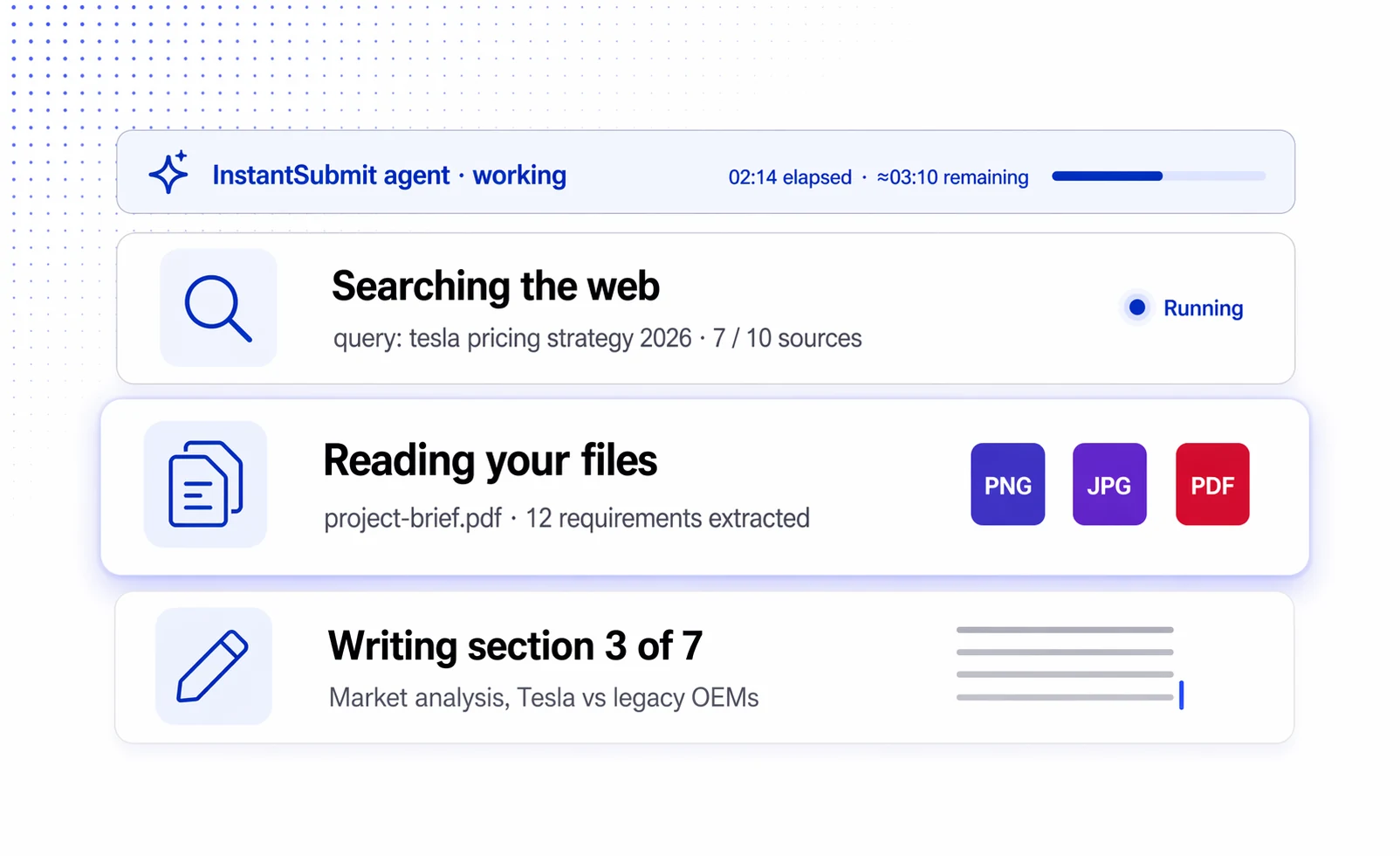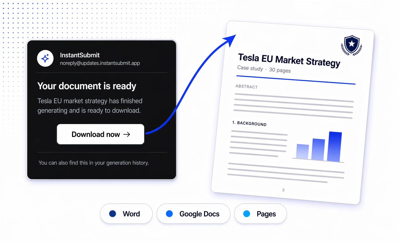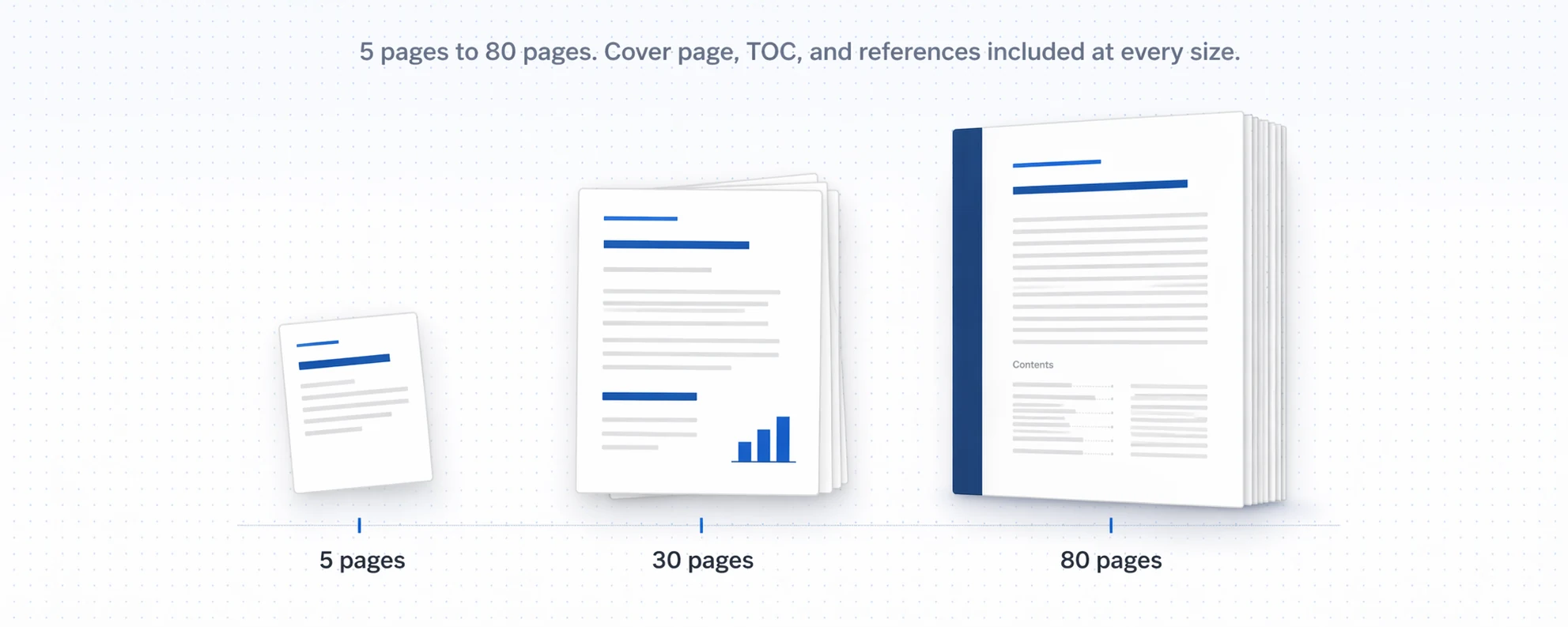 Describe what you need. We research it, write it, cite every source, and email you a finished .docx, .pdf, or .pptx. From 5-page memos to 80-page theses. Case studies, internship reports, essays, defenses. Done in minutes, not all-nighters.