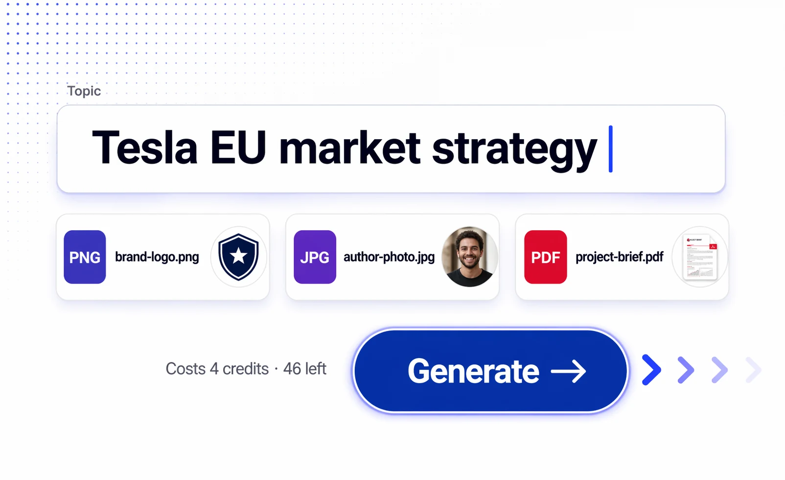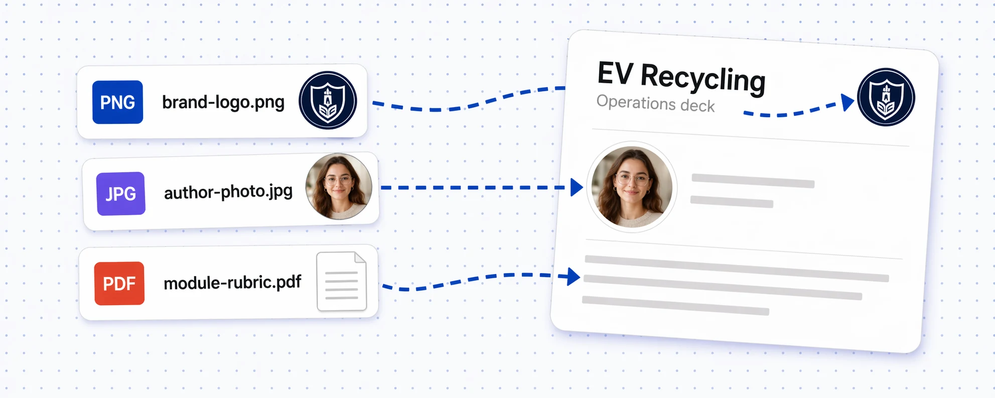 Drop in your source PDFs, your brand logo, a headshot, or charts. The agent uses them as material and places them directly into the output.